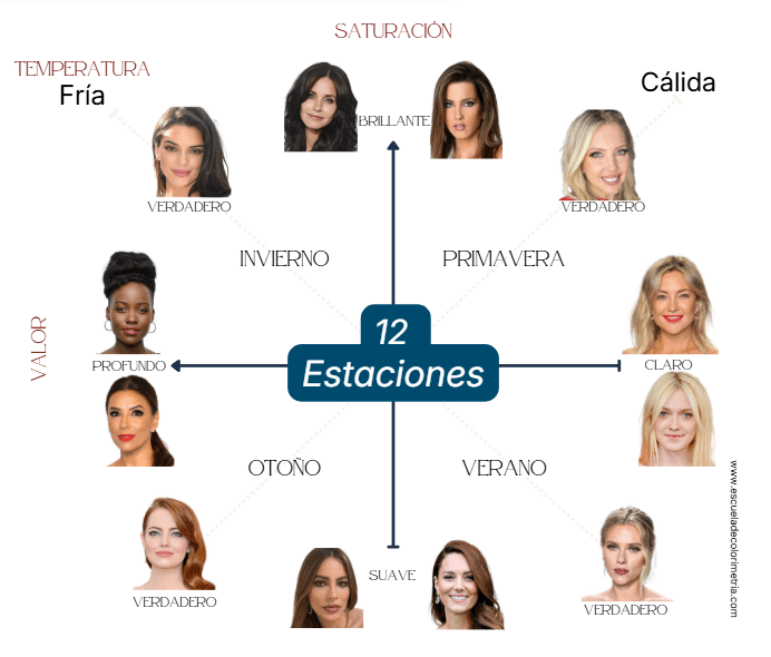 En las estaciones Puras o Verdaderas, la Temperatura es la protagonista absoluta. Pero en el resto de las estaciones (Suaves, Claras, Oscuras o Brillantes), la temperatura es el rasgo más débil de la composición. El contraste entre el amarillo (oro) y el azul (plata) es incapaz de vencer la influencia del Croma o el Valor en estas pieles.